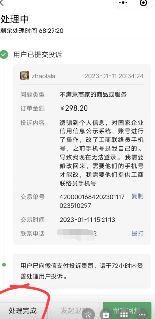 3、如果发现有投诉,要么协商解决,如需退款请到到狸云商户平台→订单退款,里面退款(退款登录账户密码在你开户时预留的邮箱里),协商好或者退款后,点处理完成,逾期不处理投诉会关闭支付权限